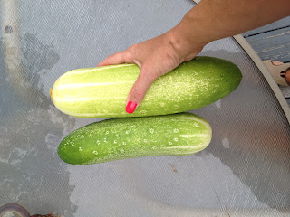 When we got back we picked some vegetables from our garden. Last year we were amazed at the size of our cucumbers. Well, 2012 has last year beat! See?